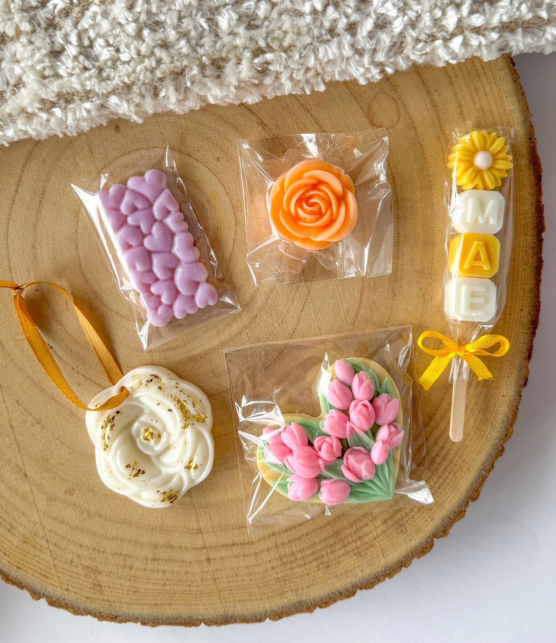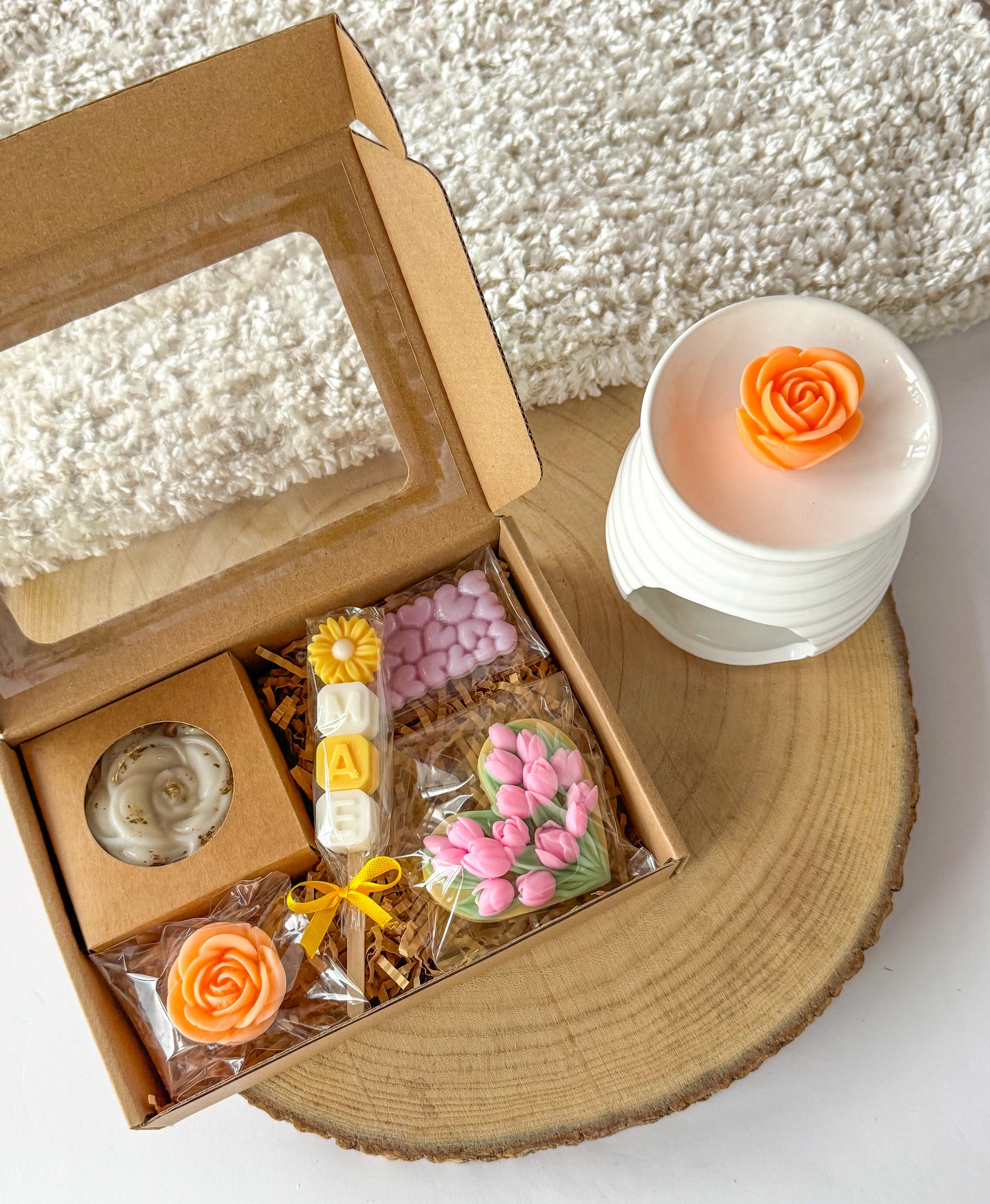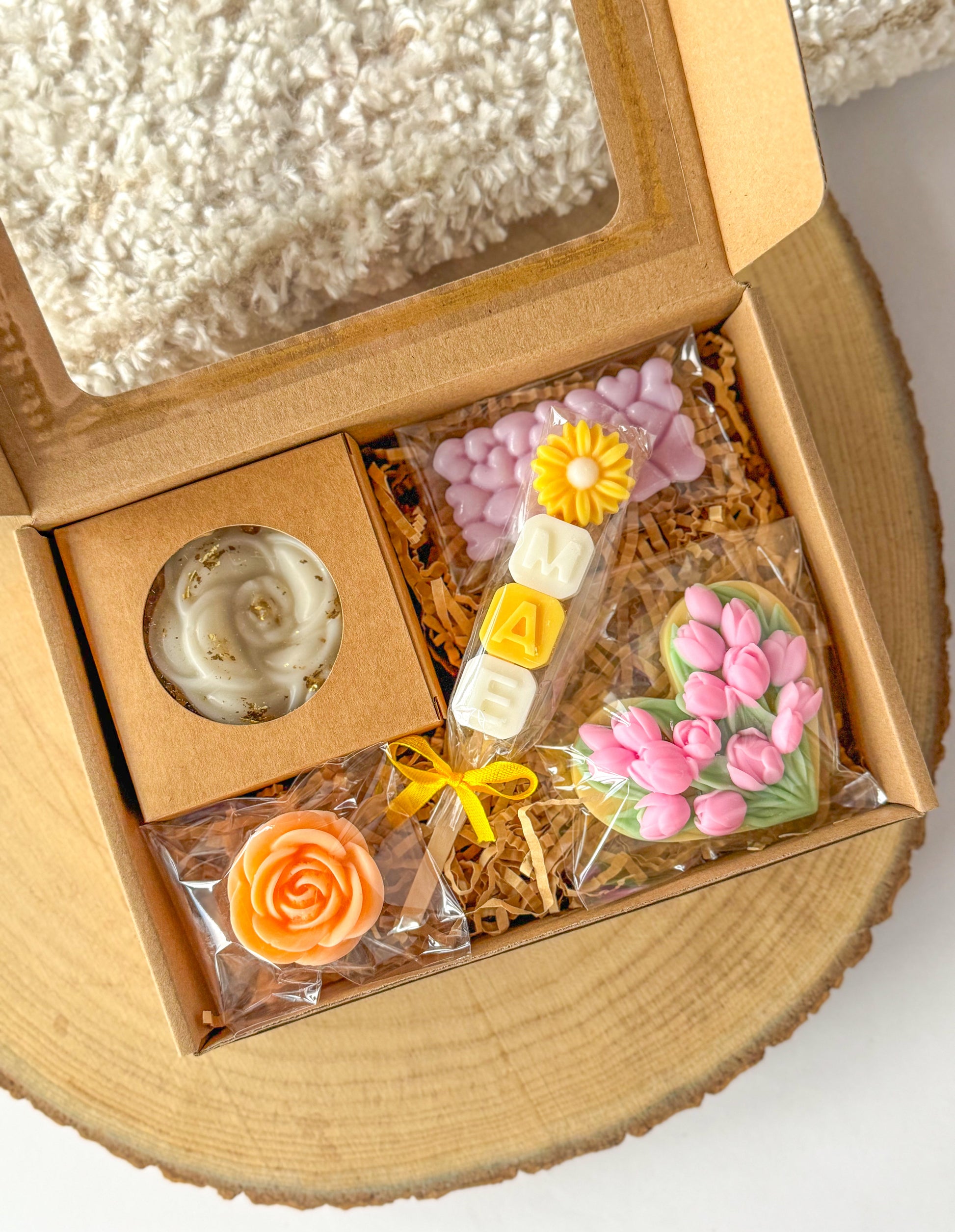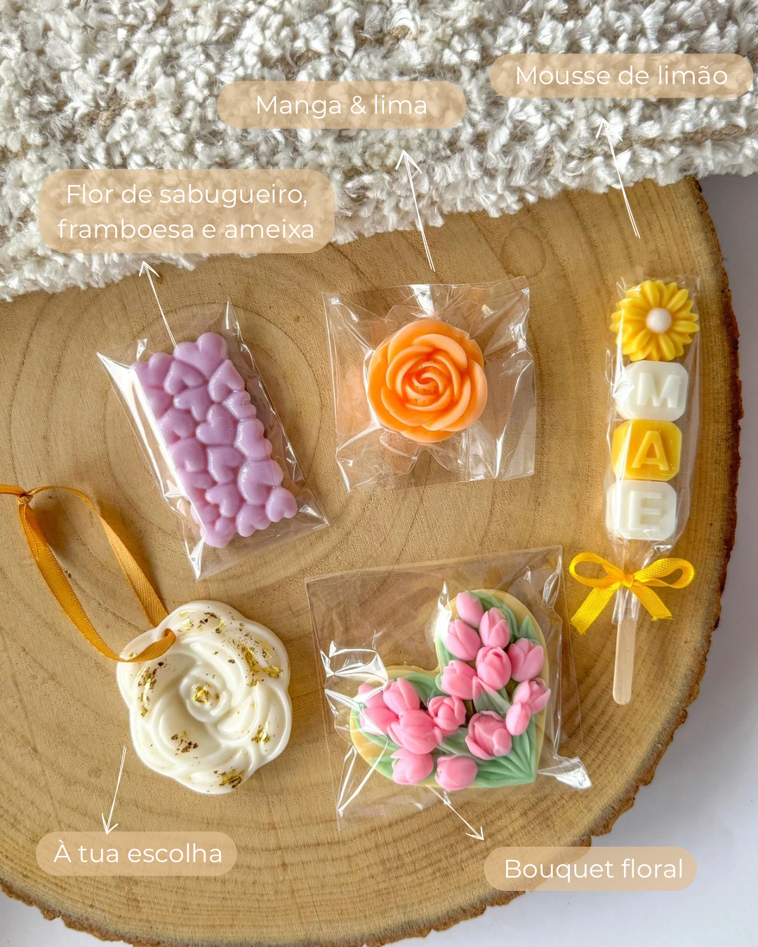 - 1 wax melt com a palavra “mãe” (com um aroma à tua escolha) - a cor e o estilo variam conforme o aroma escolhido